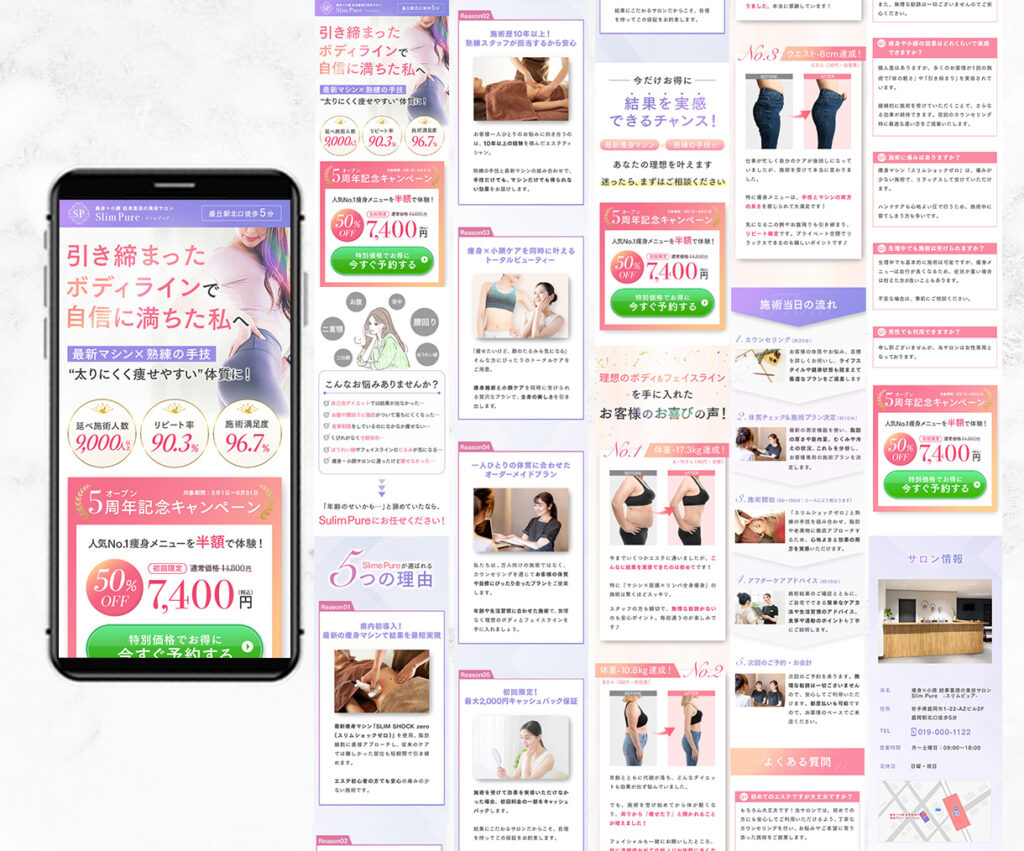 担当範囲原稿制作、デザイン制作、コーディング 制作ツールPhotoshop,VScode 制作ポイント痩身サロンのキャンペーン用LPを制作しました。ベネフィット訴求かつ数字の入ったUSPで権威性を高めたFVに仕上げました。キャンペーンのお得感と、タップしたくな...