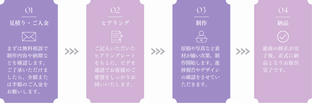 ヒアリングの実施、原稿などが揃ってからの制作開始とさせていただいております。